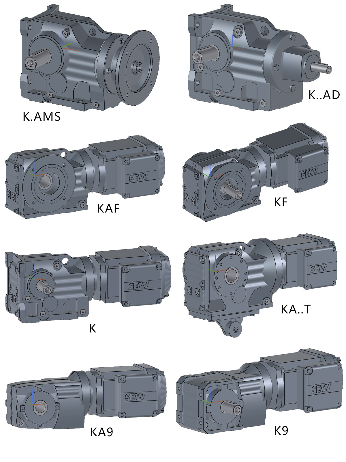 产品系列: K..39和K..49完善了2级斜齿轮-锥齿轮减速机系列。它们与K..19和K..29一同设定标准:4种规格产品提供的扭矩范围达到80 Nm至500 Nm。运用模块化概念,将K系列减速机与交流电机相连,组合形成 K..DR.. 斜齿轮-锥齿轮减速电机,以及与伺服电机相连,组合形成 K..CMP 斜齿轮-锥齿轮伺服减速电机 。也可以单独选择符合您要求的交流电机或伺服电机。